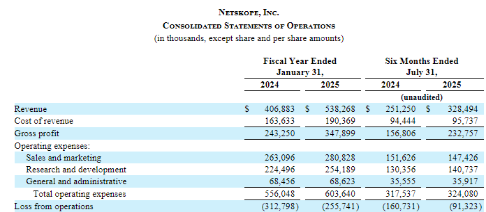 Really nice ARR growth, but unprofitable. “Our Annual Recurring Revenue (“ARR”)8 increased 33% year-over-year to $707 million as of July 31, 2025, compared to $531 million as of July 31, 2024. Net loss improved to $170 million for the six months ended July 31, 2025, compared to $207 million for six months ended July 31, 2024.”