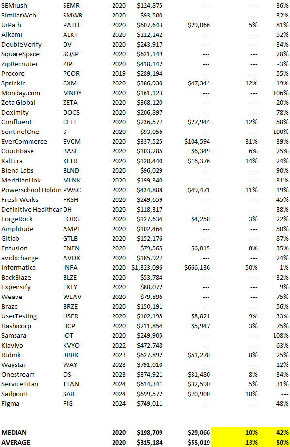 Many SaaS businesses have some services/one-time revenue. While this type of revenue doesn’t have enterprise value, customers do expect to pay some level of onboarding or up front cost for enterprise grade software, so charge for it. The list below shows the last 79 SaaS companies that went public on median generated 10% of their revenue from non-SaaS sources and 13% on average (27 of the 79 reported non-recurring revenue, or 35%). A few things to know:
