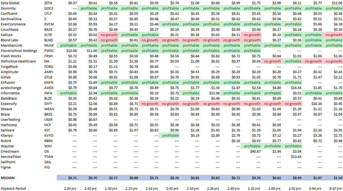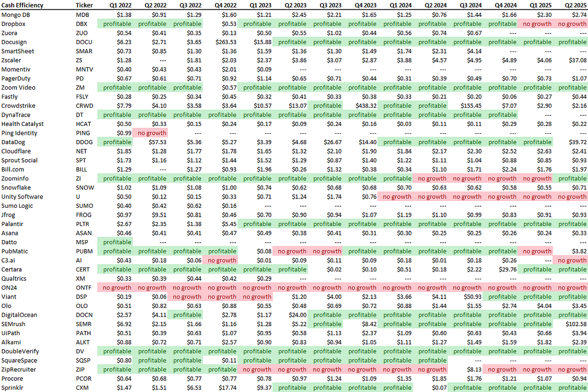 Every quarter we look at the ‘cash efficiency’ of SaaS companies that have IPO’d since October 2017. The definition of cash efficiency is net new revenue/operating loss over the past year, so the higher the figure, the more revenue is being added for each dollar of loss. The reciprocal of this formula is the payback period on your net loss, so for instance if you have net new revenue/operating loss of $0.50, your payback period is 2 years (no good). If it’s $0.75, your payback period is 1.5 years (good), and if it’s $1.00 your payback period is 1 year (excellent). Note that for companies that are profitable or failing to grow, cash efficiency and payback period ratios don’t apply and we have marked those companies accordingly. The data for Q2 2025, measured over the last 12 months is below.