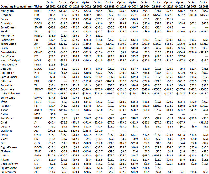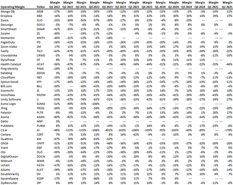 Margin has really improved. In Q1 2022, operating margin on median was -30%. Since then, the margin has improved trending to -8% as of Q2 2025. Note the operating margin got as good as -5% in Q4 2024, but has since been elevated.