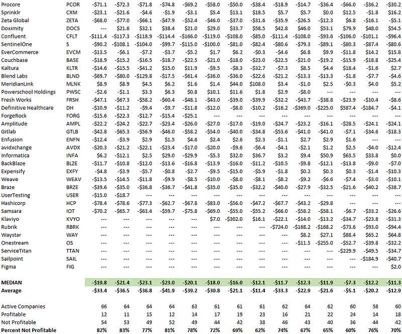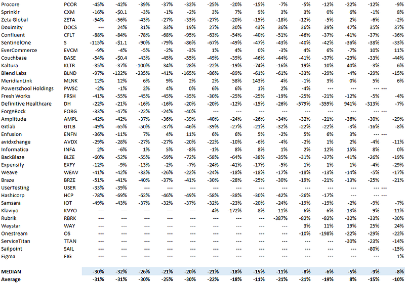 It seems like operating margins may be steadying out at -8% or so, but we need to see more quarters to call it a trend. We do not expect the sector to attain significant profitability on median nor should they: growth is far more valuable in SaaS than profitability, so long as that growth is cash efficient. We actually recommend to our companies to continue burning cash so long as they’re adding $0.70 of high quality 100%+ NDR for every $1 of net loss.