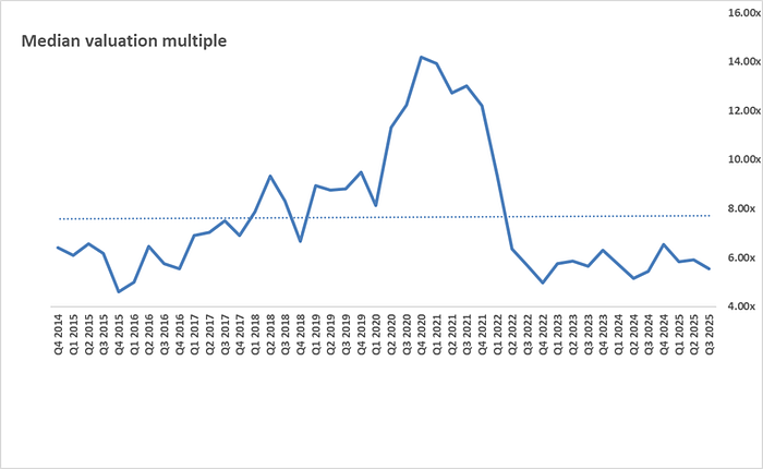SaaS multiples in Q3 continue to be soft, but we are seeing “premium” SaaS command stronger multiples. Of the 87 publicly traded SaaS companies we follow, the median multiple was 5.54x revenue while the average was 8.89x.