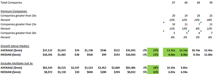 The heyday of 2020 has not returned, and probably won’t. 23% of companies are trading at 10x revenue or greater, whereas the peak was 60% in Q4 2020. 5 companies trade above 20x whereas 35 traded above 20x in Q4 2020. Additionally, the gap between the average and median is 3.3x, meaning premium SaaS companies are getting higher valuations and that gap is up from Q1 when it was 2.2x. Note however the gap was really wide in 2020 and 2021 at ~5.8x.
