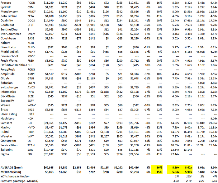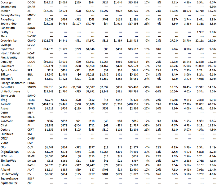 Press enter or click to view image in full sizeRemovals. We’ve removed companies that continue to show extreme distress. They have a combination of distressed valuations, no growth, and/or no profitability. They should not be used to assess multiples for a healthy company going through M&A. More recent removals include LivePerson, Brightcove, Upland, Viant, ON24, ZipRecruiter, Yext, Secureworks, Instructure, Expensify, and Fastly (UiPath is on watch).