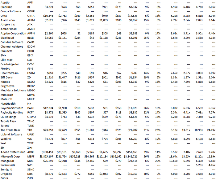 The stats. The median SaaS business had trailing twelve month revenue of $1.0bln, EBITDA of $38mm, and positive operating cash flow of $200mm thanks to up-front collections on annual contracts. YOY growth is 15% on median. The median EBITDA margin is 6%. Debt is negligible. While 37 of the companies have negative EBITDA, only 3 have negative cash flow.