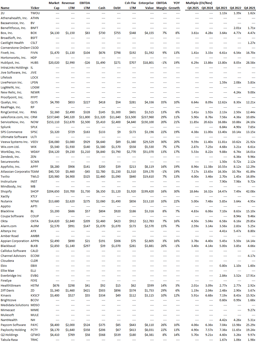 Removals. We’ve removed companies that continue to show extreme distress. They have a combination of distressed valuations, no growth, and/or no profitability. They should not be used to assess multiples for a healthy company going through M&A. More recent removals include LivePerson, Brightcove, Upland, Viant, ON24, ZipRecruiter, Yext, Secureworks, Instructure, Expensify, Fastly, Definitive Healthcare, and Pubmatic.